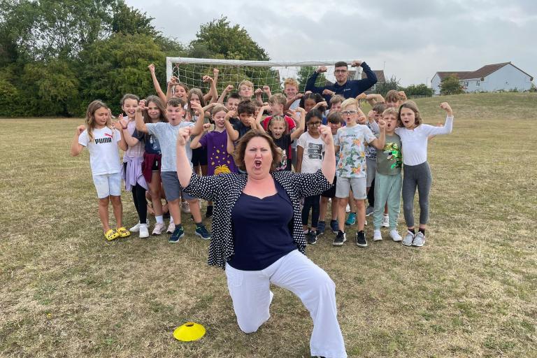 [Above] Cllr Jane Carr, Cabinet Member for Inequalities, with children enjoying a free football session at Portfields Primary School.